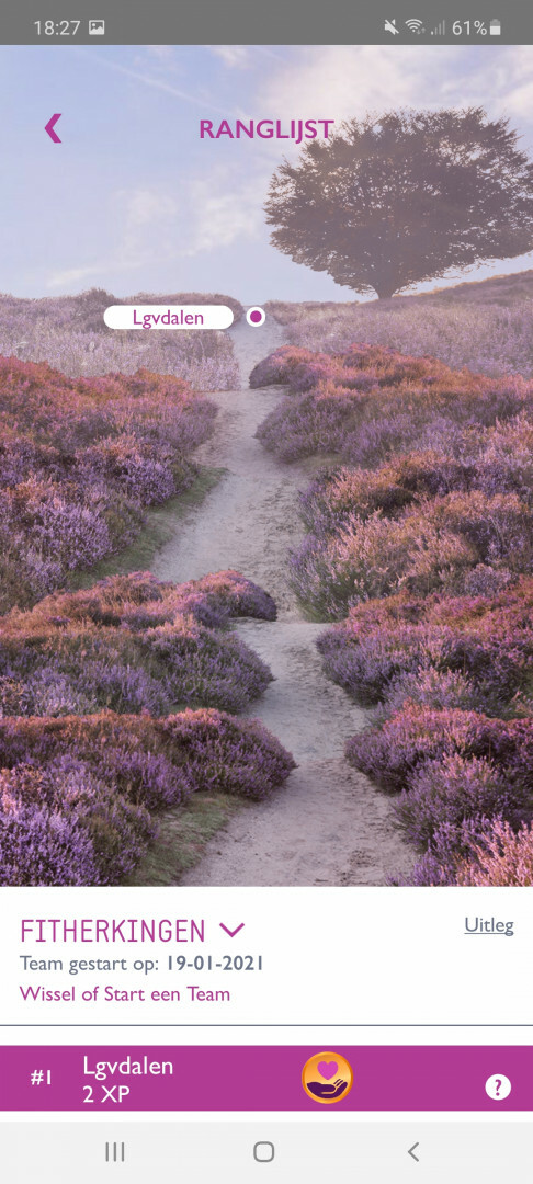 Je kunt meedoen in meerdere groepen. Elke rondje dat je loopt van 20 minuten telt mee voor punten. Zoals je op de foto kan zien sta ik nu nog alleen in de app. Ik heb al stiekem een rondje gelopen gisteravond... dus wie haalt me in?